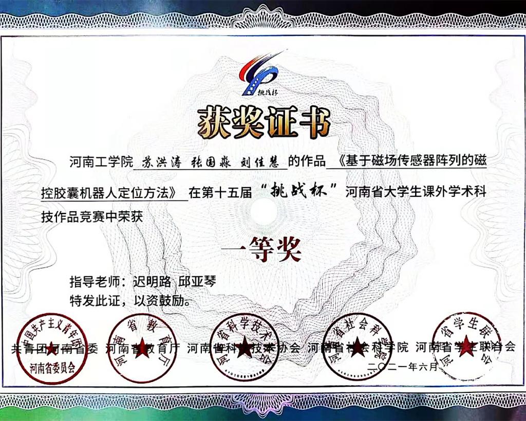 “挑战杯”系列竞赛是目前国内大学生关注度最高的综合类学科竞赛之一。本届省赛共吸引省内各高校的近万项作品参赛。经过前期充分准备及培育,我校共推荐29项作品参与省赛的角逐。经过初选、答辩、现场演示等环节的评审,有27项作品获奖。其中,智能工程学院教师迟明路和邱亚琴指导的《基于磁场传感器阵列的磁控胶囊机器人定位方法》获得省一等奖。