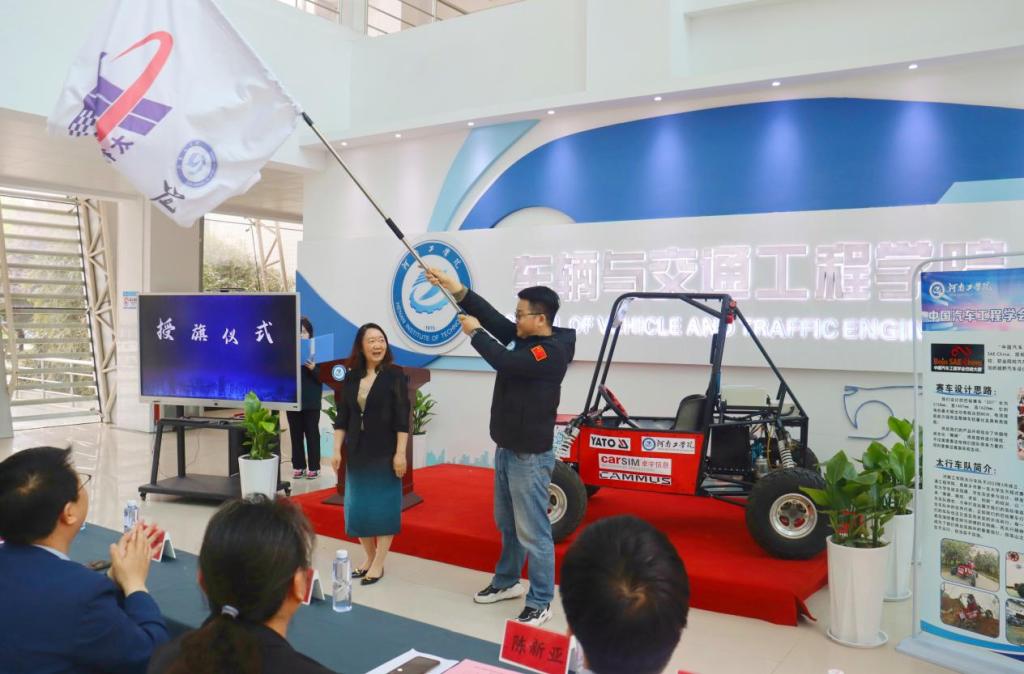 刘莉莉与车辆与交通工程学院院长陈新亚共同为新车E07揭幕,E07这辆由学生自制、代表着新赛季新希望的赛车完美亮相,热烈的掌声响彻全场。刘莉莉为太行车队授旗,车队指导教师胡延明接过旗帜,飘舞的旗帜展现了车队拼搏共创、勤恳钻研的理念和开拓进取、自强不息的学校精神。