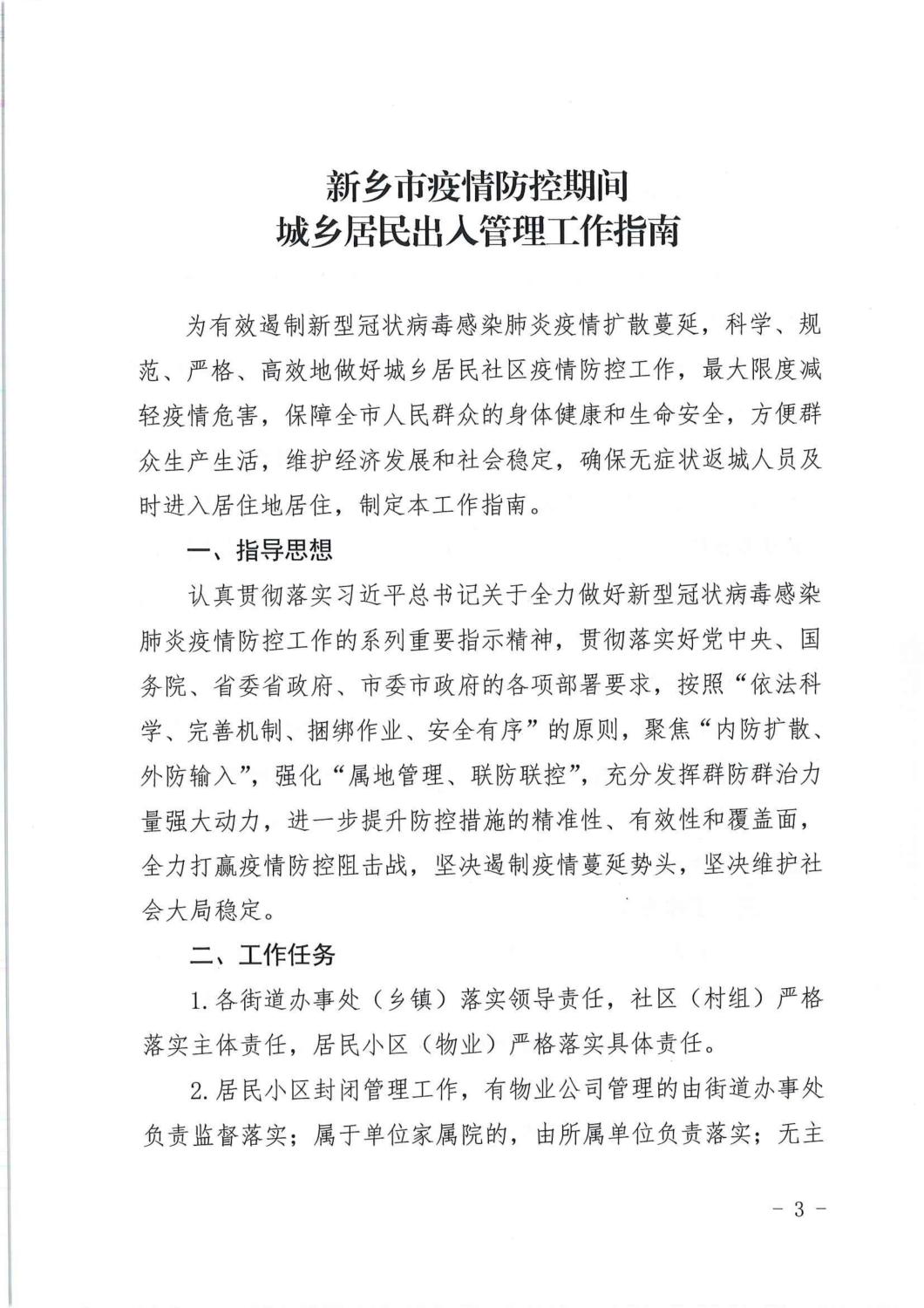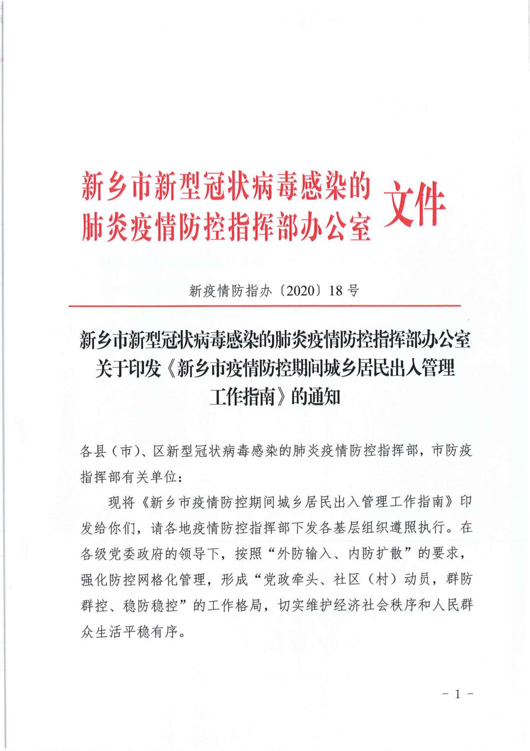 【疫情防控通告八】关于印发《新乡市疫情防控期间城乡居民出入管理工作指南》的通知