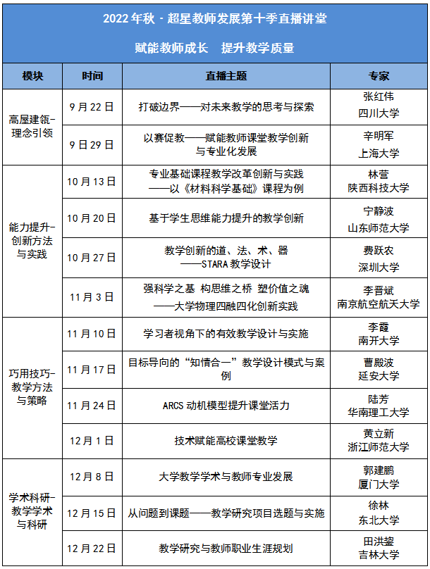 1.课程设置。直播课堂开设有理念引领、创新方法与实践、教学方法与策略、教学学术与科研四个模块共计13个专题讲座(详见附件2)。