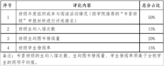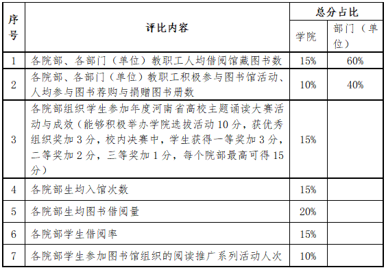书香学院(部门)评比是利用信息化的客观数据对主要的阅读相关事项进行量化,根据量化结果,由学校图书情报工作委员会授予总分排名前3名的学院(含厚德书院)为河南工学院2024年度“书香学院”荣誉称号,总分排名前2名的部门(单位)为2024年度“书香部门”荣誉称号(书香学院和书香部门分开评比),评分标准详见表1。