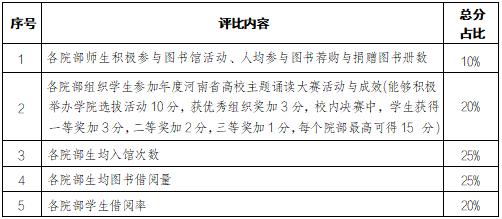 书香学院评比是利用信息化的客观数据对主要的阅读相关事项进行量化,根据量化结果,由学校图书情报工作委员会授予总分排名前3名的学院(含厚德书院)为河南工学院2025年度“书香学院”荣誉称号。评分标准详见表1。
