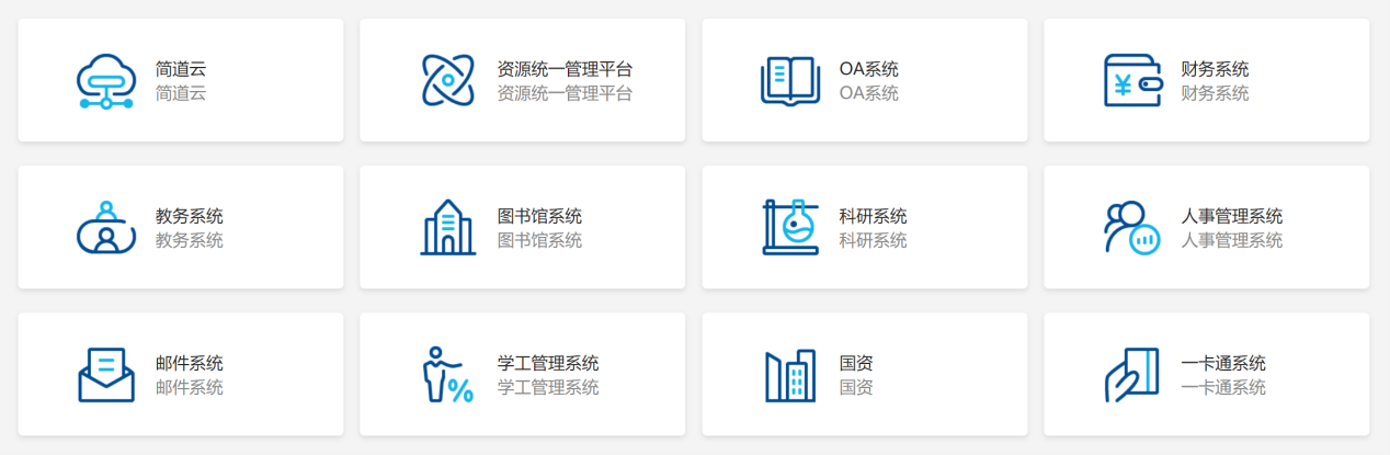 目前,我校已完成12个业务的单点集成,包含:教务系统、学工系统、人事系统、OA系统、财务系统、一卡通系统、科研系统、国资系统、邮件系统、资源统一管理平台(webVPN)、简道云系统、图书馆系统。